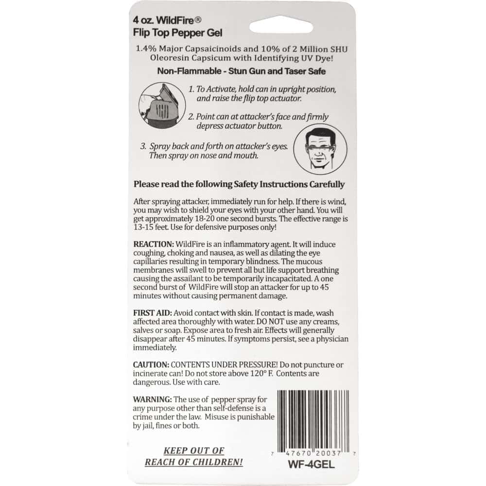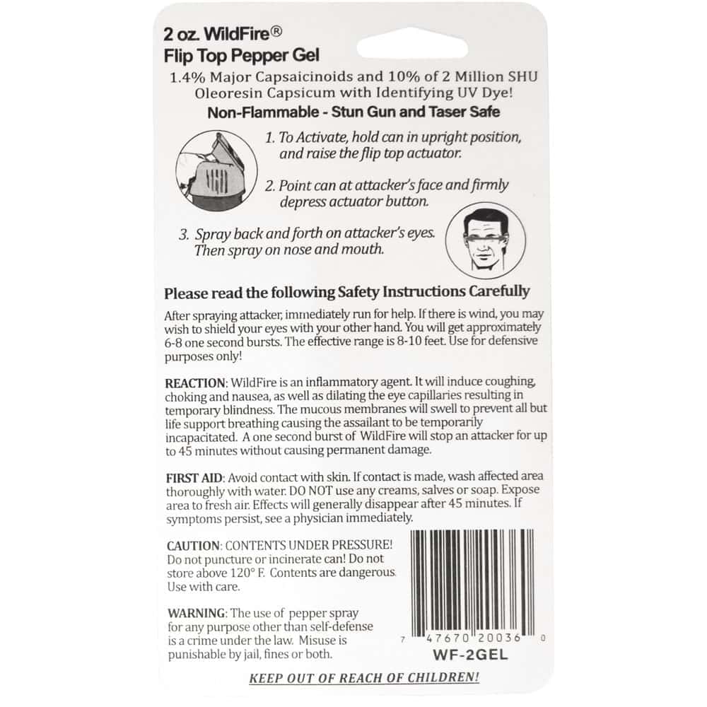 Wildfire 1.4% MC flip top actuator pepper gel stream. The WILDFIRE® PEPPER SPRAY is hot, hot, hot. The Major Capsaicinoids are the true heat measure, WildFire has the hottest on the market at 1.4% Major Capsaicinoids. In addition to causing an attacker pain, The WildFire 10% oleoresin capsicum formula swells the mucous membranes, which makes breathing difficult, and swells the veins in the eyes, causing the eyes to close.